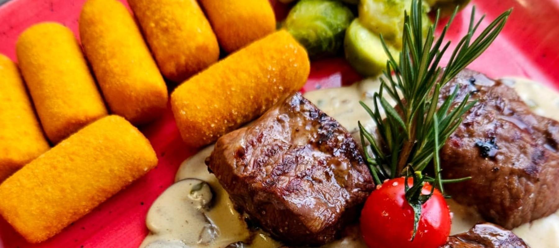 gebratene Reh- und Hirsch-Medaillons aus heimischer Jagd an Champignonsoße mit Rosenkohl und Kroketten