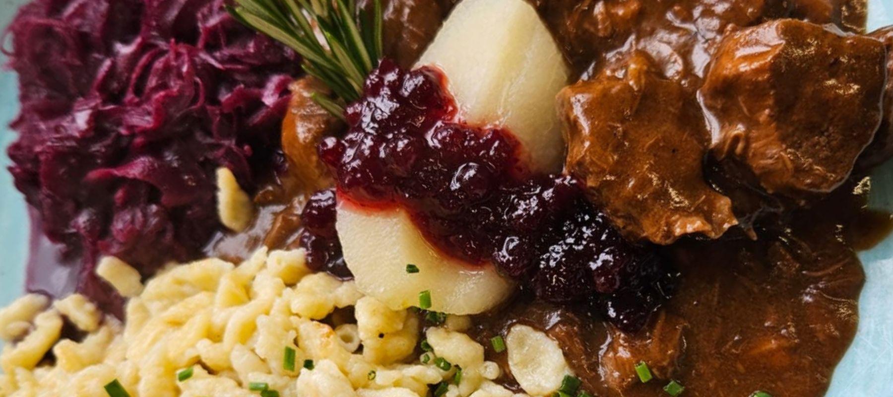 geschmortes Wildragout aus der Region an Preiselbeersoße mit Rotkraut und hausgemachten Spätzle